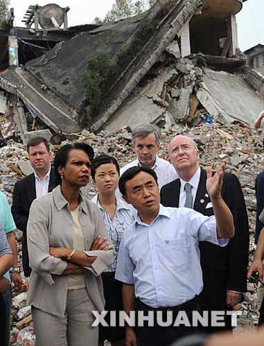 6月29日,美國國務卿賴斯(前左)在都江堰市一個體育俱樂部的廢墟上聽取介紹災情。