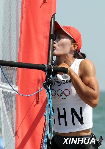 8月20日,獲得冠軍的中國選手殷劍賽后興奮地親吻帆具。當日,北京奧運會女子帆板獎牌輪比賽在青島舉行,中國選手殷劍獲得冠軍。新華社記者王頌攝