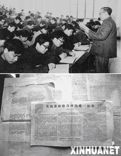 上圖:1979年《實踐是檢驗真理的唯一標準》的初稿作者胡福明在南京大學哲學系講課。 下圖:刊有《實踐是檢驗真理的唯一標準》文章的《光明日報》和修改過的清樣。 新華社發