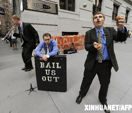 2008年10月14日 失業人員華爾街街頭賣藝 10月13日,在美國紐約的華爾街,幾名失業的金融業從業人員在街頭賣藝掙錢。 新華社/法新