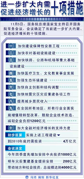 在世界金融危機日趨嚴峻的背景下,為抵御國際經濟環境對中國的不利影響,中國國務院11月5日召開會議,提出實行積極的財政政策和適度寬松的貨幣政策,出臺10項更加有力的擴大國內需求的措施。