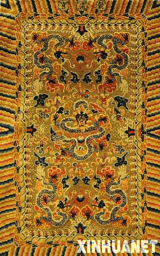 這是展出的清乾隆“乾清宮”壁毯(11月18日攝)。 當日,北京北緯拍賣公司舉行2008宮廷藝術品高峰論壇,預熱即將于12月6日舉行的秋季宮廷藝術品拍賣會。數十位海內外收藏家、宮廷藝術品研究專家參加論壇,共賞宮廷藝術珍品。現場還展出七件清宮龍袍、明末銅鎏金龍鳳紋馬鞍、清康熙青花五彩十二月令花卉杯、清乾隆“乾清宮”壁毯等將在拍賣會上參與拍賣的一批宮廷藝術珍品,讓人大開眼界。 新華社記者徐亮攝