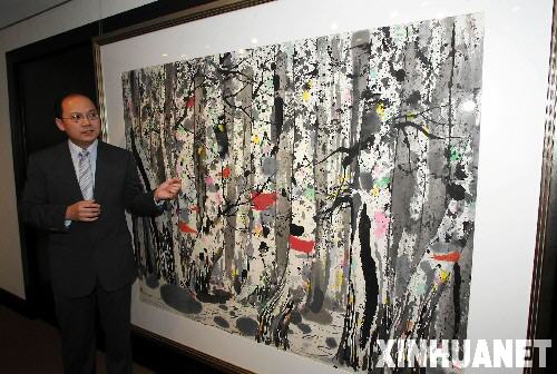 11月18日,香港書畫專家介紹一幅估價約400至500萬港元的吳冠中作品《白樺林》。 當日,一批將于12月2日在香港佳士得拍賣的部分中國古代及近現代書畫精品在香港展出。 新華社記者 張鳳國 攝