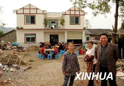 11月16日,四川省安縣花街鎮雍峙村村民張學鐘(右一)和妻子(右二)在自己剛剛建起的新房前。張學鐘家原來300多平方米的房子在地震中全部倒塌,他用近年打工的積蓄,加上國家補貼和貸款,新建了這幢近300平方米的新房。 四川地震災區群眾自籌資金,并在政府補貼和貸款政策的幫助下,積極開展災后重建,許多地方已經矗立起一幢幢新房。 新華社記者陳燮攝