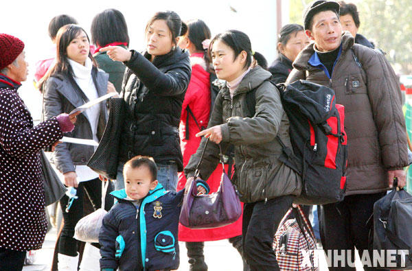 12月15日,一群農民工結伴趕往蘇州火車站準備乘車返鄉。 離2009年春運還有20多天時間,蘇州火車站及蘇州各長途汽車站提前迎來外來務工人員返鄉客流高峰。 新華社發(王建中 攝)