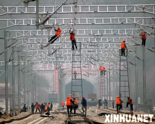 11月23日,中鐵電氣化局集團西安電化公司員工在安徽金寨火車站進行電氣化鐵路施工。全長359.36公里的合(肥)武(漢)客運專線電氣化鐵路預計年底投入運營。 新華社發 (倪樹斌 攝)