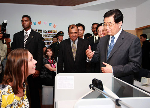 2月17日,正在毛里求斯訪問的國(guó)家主席胡錦濤參觀中國(guó)文化中心。這是胡錦濤主席同正在這里學(xué)習(xí)漢語(yǔ)的學(xué)員親切交談。新華社記者 鞠鵬攝