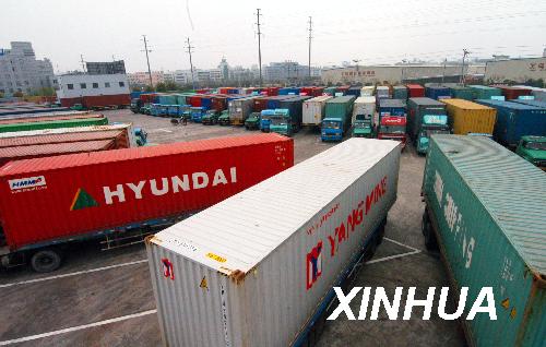4月1日在浙江義烏國際物流中心拍攝的待發的集裝箱車。據金華海關駐義烏辦事處統計,截至3月26日,義烏當月出口集裝箱量達到40605標箱,比去年同期增長6.8%。新華社發(張建成攝)