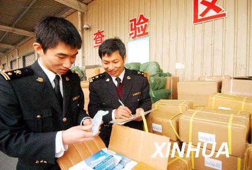 4月1日,在浙江義烏國際物流中心,海關工作人員查驗出口貨物。 新華社發(張建成 攝)