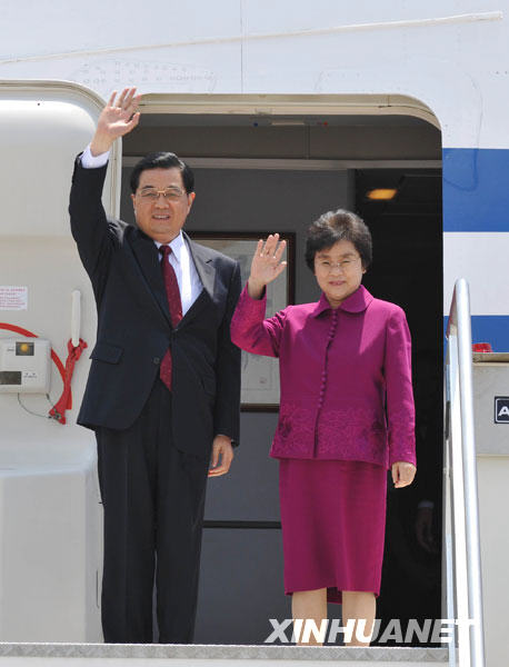 7月5日,中國國家主席胡錦濤抵達(dá)羅馬,開始對意大利進(jìn)行國事訪問,并將出席9日在意大利拉奎拉舉行的八國集團(tuán)同發(fā)展中國家領(lǐng)導(dǎo)人對話會議。這是胡錦濤和夫人劉永清向前來歡迎的人們揮手致意。新華社記者黃敬文攝