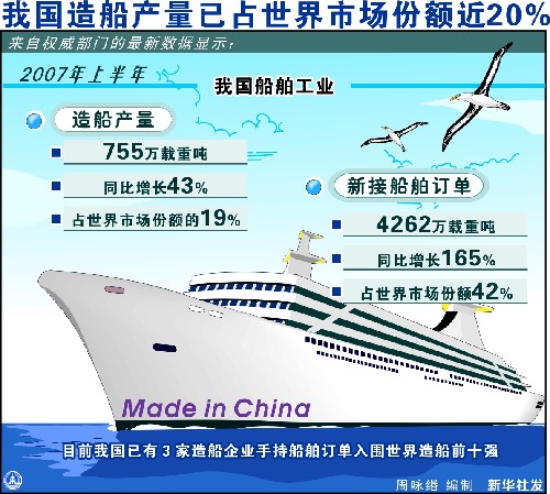 ——海洋船舶工業 2007年上半年,我國海洋船舶工業繼續保持快速增長態勢,主要經濟指標大幅增加,行業發展開端良好。沿海地區海洋船舶工業實現增加值151.40億元,比上年同期增長28.0%。其中兩大船舶集團公司(中國船舶重工集團公司、中國船舶工業集團公司)上半年實現海洋船舶工業增加值77.6億元,造船產量共計388.9萬綜合噸,造船完工量83艘,修船完工量410艘。上半年,我國承接新船訂單量大幅度增長,首次超過韓國,躍居世界第一。