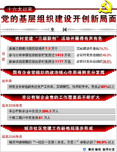 黨的十六大以來,在經濟和社會生活發生廣泛而深刻變化的歷史背景下,黨的建設不斷加強,黨組織覆蓋面不斷擴大,工作方法和活動方式不斷改進,各級黨組織和廣大黨員在深化改革、促進發展、保持穩定、構建社會主義和諧社會中以及抗擊重大自然災害、防控重大疫情、處理突發事件的緊要關頭,都顯示出了強大的戰斗力,發揮了不可替代的重要作用。分布在全國各條戰線、直接聯系著社會各階層群眾的廣大黨員充分發揮先鋒模范作用,廣大基層黨組織開展卓有成效的工作,必將帶領各族人民奪取全面建設小康社會新勝利,開創中國特色社會主義事業新局面。