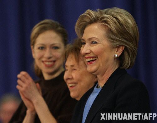 1月1日,在美國艾奧瓦州的艾姆斯,美國民主黨總統競選人希拉里·克林頓(右)和她的女兒切爾西以及母親多蘿西·羅德姆一起參加競選集會。美國總統選舉黨內初選即將于1月3日在艾奧瓦州開鑼,民主黨和共和黨將分別舉行基層黨員會議,推舉參加高級黨員會議的代表,以選擇本黨總統候選人。 新華社/法新