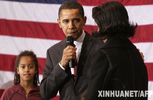 1月1日,在美國艾奧瓦州的得梅因,美國民主黨總統競選人巴拉克·奧巴馬(中)一家一起參加競選集會。美國總統選舉黨內初選即將于1月3日在艾奧瓦州開鑼,民主黨和共和黨將分別舉行基層黨員會議,推舉參加高級黨員會議的代表,以選擇本黨總統候選人。 新華社/法新
