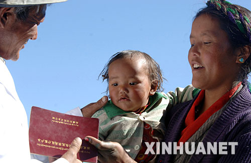 資料圖片:拉薩曲水縣達嘎鄉其奴村的拉珍(右)帶著孩子到村衛生所看病(2007年11月26日攝)。新華社記者 格桑達瓦 攝