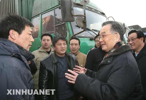 1月25日下午,中共中央政治局常委、國(guó)務(wù)院總理溫家寶來到京石高速公路河北涿州服務(wù)區(qū)和北京西站實(shí)地考察,并就做好春運(yùn)工作,保障安全暢通作出部署。這是溫家寶總理在京石高速公路河北涿州服務(wù)區(qū)與貨車司機(jī)交談。 新華社記者姚大偉攝