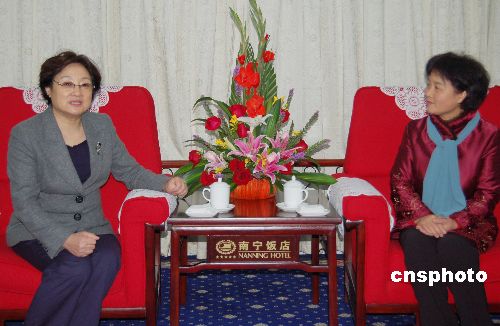 2月2日晚,在僑鄉(xiāng)廣西遭遇嚴(yán)重雨雪冰凍災(zāi)害急需援助之際,中國(guó)國(guó)務(wù)院僑辦主任李海峰女士(左)一行從北京飛赴南寧進(jìn)行慰問,并與廣西自治區(qū)人大常委會(huì)副主任、廣西紅十字會(huì)會(huì)長(zhǎng)劉新文進(jìn)行會(huì)談,隨后李海峰代表國(guó)務(wù)院僑辦和海外僑胞向廣西災(zāi)區(qū)民眾捐助一百萬元人民幣。 中新社發(fā) 劉萬強(qiáng) 攝