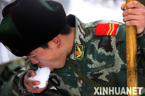 資料圖片:2月3日,一名武警戰士在京珠高速公路破冰鏟雪間隙用冰解渴。 新華社記者 李剛 攝
