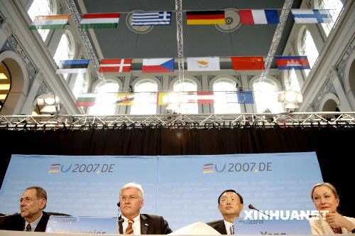 資料:2007年5月28日,在德國漢堡,中國外交部長楊潔篪(右二)、德國外長施泰因邁爾(左二)、歐盟委員會對外關系委員瓦爾德納(右一)、歐盟負責外交和安全政策的高級代表索拉納(左一)出席中歐外長會晤后的聯合新聞發布會。 新華社記者吳曉凌攝