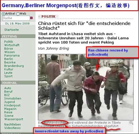 類似的“張冠李戴”還有不少。德國《柏林晨報》網站18日將一張西藏公安武警解救被襲漢族人的照片硬說成是在抓捕藏人;美國福克斯電視臺網站刊登圖片稱,中國軍人將藏人抗議者拉上卡車,可圖片中明明是印度警察。德國NTV電視臺也在報道中將尼泊爾警察抓捕藏人抗議者說成是“發生在西藏的新事件”。