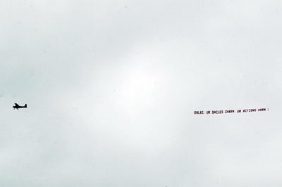 4月14日,西雅圖上空飛機拖出抗議標語:“達賴:你的微笑很吸引人,但是你的行動很傷害人。”(Dalai: your smiles charm but your actions harm)