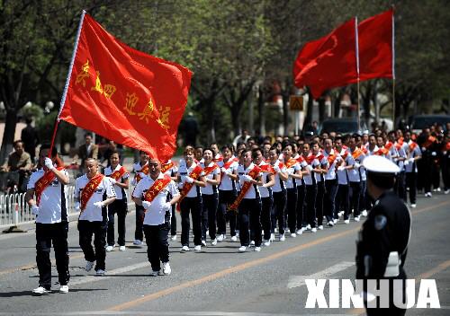 5月4日,呼和浩特市公交公司方隊的員工在接力長跑活動中。當日,呼和浩特市舉行“慶五四 迎奧運”萬人接力長跑活動,來自機關、學校、武警、公安和市公交公司等單位的萬余人參加了接力長跑活動,以慶祝“五四”青年節,喜迎北京奧運會。 新華社記者任軍川攝