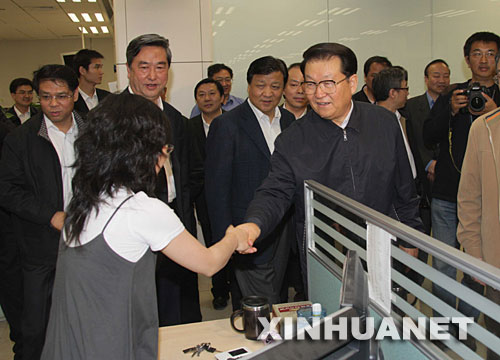 5月16日深夜,中共中央政治局常委李長春先后來到新華社和中央電視臺,代表黨中央、國務院和胡錦濤總書記,看望慰問抗震救災新聞工作者,向奮戰在抗震救災宣傳報道第一線的全體同志致以親切的慰問和崇高的敬意。中共中央政治局委員、書記處書記、中宣部部長劉云山一同看望慰問。 這是李長春在新華社新聞信息發稿中心聽取抗震救災圖片發稿情況匯報。 新華社記者 龐興雷 攝