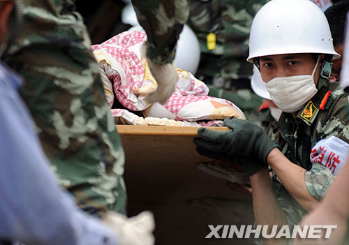 5月15日,消防戰士在四川省什邡市鎣華鎮云峰化工廠倒塌的宿舍樓廢墟中營救出一名生還者。新華社記者 姜帆 攝