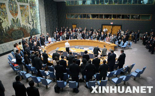 5月20日,在美國紐約聯合國總部舉行的聯合國安理會會議上,聯合國秘書長潘基文(中)與安理會成員集體默哀,對中國四川汶川大地震遇難者表示哀悼。 新華社記者侯俊攝