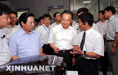 7月4日至6日,中共中央政治局常委、國務院總理溫家寶在江蘇、上海就經濟運行情況進行調查研究。這是7月5日,溫家寶在江蘇微盟電子考察。新華社記者 饒愛民 攝