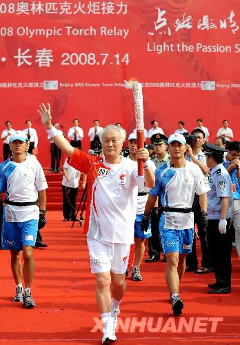 7月14日,第一棒火炬手、中科院院士王家騏開始傳遞。當日,北京奧運圣火在吉林省長春市傳遞。 新華社記者王昊飛攝