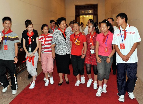 8月2日,中共中央政治局委員、國務委員劉延東在北京人民大會堂看望即將赴匈牙利、保加利亞療養(yǎng)的近100名四川汶川地震災區(qū)中小學生。 新華社記者 樊如鈞 攝