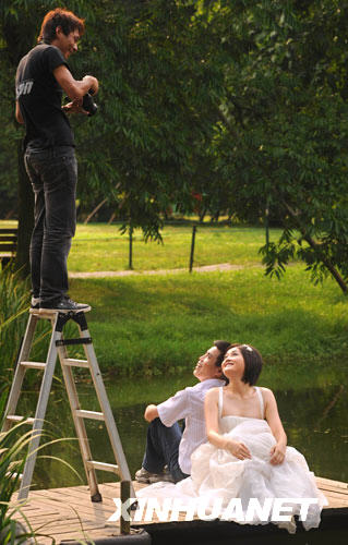 8月6日,在杭州西子湖畔,攝影師為一對(duì)來(lái)自江蘇蘇州的新婚伉儷拍照。 新華社記者 譚進(jìn) 攝