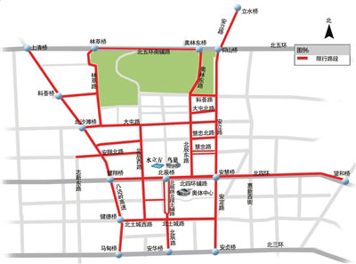 限行路段:建國門橋向北經東二環路、北二環路主路(不含輔路)至鐘樓北橋(單向);復興門橋向北經西二環路、北二環路主路(不含輔路)至鐘樓北橋(單向),除奧運專用車輛、公共汽車和持有閉幕式車證的車輛外,禁止其他車輛通行。