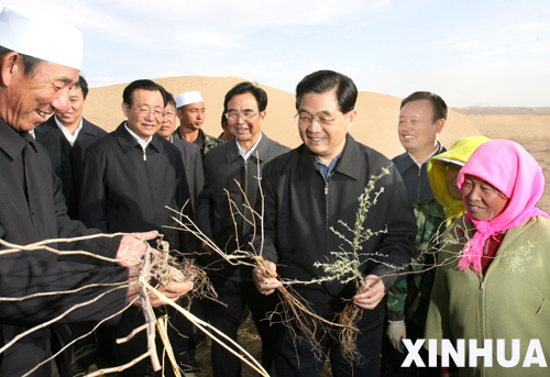 2007年4月11日至14日,中共中央總書記、國家主席、中央軍委主席胡錦濤到寧夏回族自治區考察工作。這是胡錦濤在毛烏素沙漠邊緣的白芨灘林場大泉治沙實驗區同當地干部群眾親切交談,仔細了解防沙治沙工作情況。 新華社記者鞠鵬攝(資料圖片)