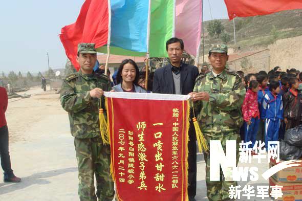 寧夏固原市彭陽縣陡坡村小學師生向寧夏軍區給水工程團給水官兵表達敬意 寧夏軍區政治部宣保處提供 張欣攝(資料圖片)