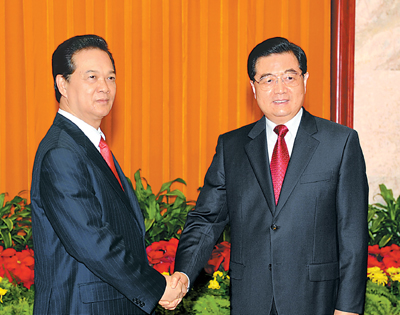 人民網北京10月22日電 (記者曹鵬程)國家主席胡錦濤22日在人民大會堂會見來華進行正式訪問并出席第七屆亞歐首腦會議的越南總理阮晉勇。