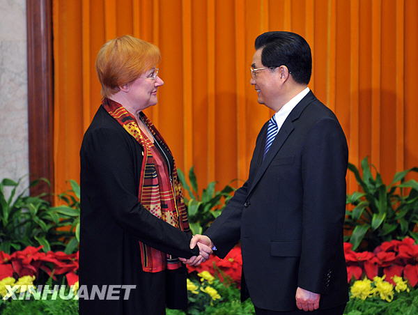 10月23日,中國國家主席胡錦濤在北京人民大會堂會見前來出席第七屆亞歐首腦會議的芬蘭總統哈洛寧。新華社記者劉建生攝