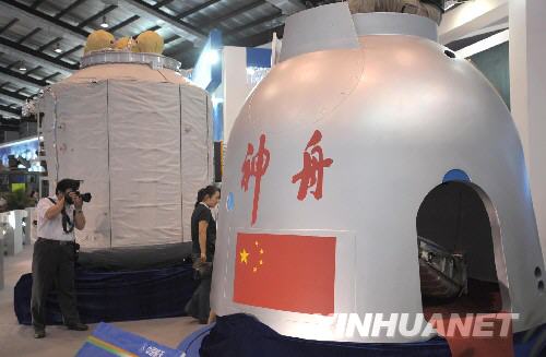 11月3日,神舟七號飛船返回艙模型(右)在珠海航展上亮相。 當(dāng)日,神舟七號飛船軌道艙的備份產(chǎn)品等一批實物、模型和圖片在第七屆中國國際航空航天博覽會(珠海航展)上亮相。珠海航展將于11月4日到9日在珠海舉行。 新華社記者 盧漢欣攝