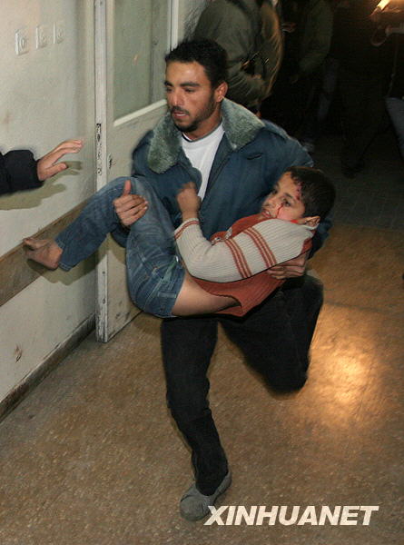 12月29日,一名巴勒斯坦男子在加沙地帶將一名受傷的男孩送往醫院。新華社發