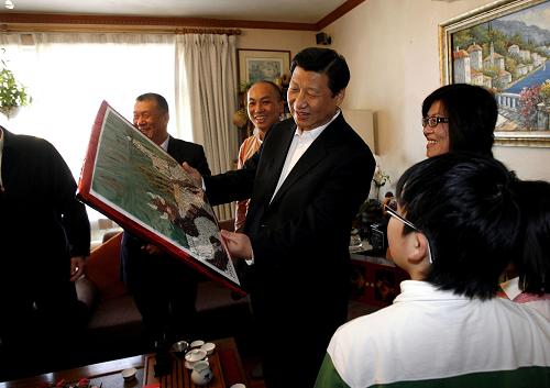 1月10日,國家副主席習近平來到澳門普通市民胡祖杰家中探訪,了解他們生活、工作情況。這是胡祖杰一家將親手制作的五谷雜糧畫作回贈習近平。新華社記者劉蓮芬攝