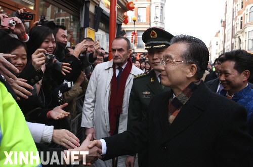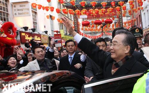 1月31日,中國國務(wù)院總理溫家寶在英國倫敦前往唐人街,向華人華僑祝賀新年。 新華社記者姚大偉攝