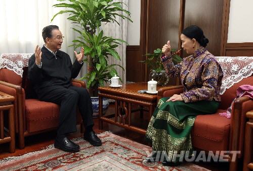 2月14日,國(guó)務(wù)院總理溫家寶邀請(qǐng)著名傣族舞蹈表演藝術(shù)家刀美蘭到中南海總理辦公室做客,與她一起探討如何更好地傳承和發(fā)揚(yáng)光大少數(shù)民族文化藝術(shù)。(新華社記者姚大偉攝)