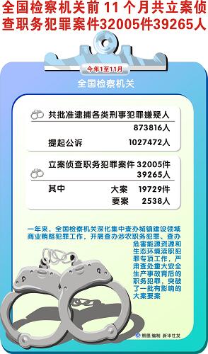 圖表:全國檢察機(jī)關(guān)前11個月共立案偵查職務(wù)犯罪案件32005件39265人 新華社發(fā)