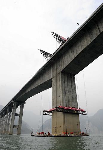 橫跨紫坪鋪水庫的廟子坪大橋全長1436米,橋墩高約100多米,它的修復在國內外備受關注。汶川地震發生后,廟子坪特大橋的10片50米長的T梁掉入水庫,直接導致已經初具通車條件的大橋從中間斷裂。