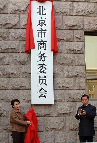 3月30日,北京市副市長程紅(左)為調整后的北京市商務委員會揭牌。北京市政府機構調整日前正式啟動,預計將于2009年上半年完成。新華社記者 公磊 攝