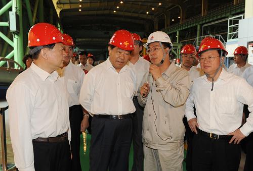 6月11日至15日,中共中央政治局常委、全國政協主席賈慶林在遼寧調研。這是6月12日,賈慶林在大連長興島臨港工業區STX集團發動機工廠視察發動機生產情況。新華社記者 黃敬文 攝