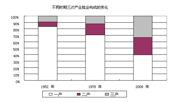 新中國成立以前,我國的第二產(chǎn)業(yè)和第三產(chǎn)業(yè)十分落后,絕大部分勞動者以務農(nóng)為生。1952年全國就業(yè)人員的83.5%從事第一產(chǎn)業(yè),第二產(chǎn)業(yè)、第三產(chǎn)業(yè)就業(yè)人員只占全部就業(yè)人員的7.4%和9.1%。新中國成立后,我國迅速建立了完整的工業(yè)體系,促進了二、三產(chǎn)業(yè)就業(yè)人員的迅速增加。1978年末,第二產(chǎn)業(yè)的就業(yè)比例上升到17.3%,第三產(chǎn)業(yè)的就業(yè)比例達到了12.2%。特別是改革開放以后,針對過去產(chǎn)業(yè)結(jié)構(gòu)偏重少輕的情況,將發(fā)展重點轉(zhuǎn)向與人民生活密切相關(guān)的輕工業(yè)、商業(yè)、飲食業(yè)、服務業(yè)、修理業(yè)以及制約國民經(jīng)濟發(fā)展的交通運輸、郵電通訊、金融保險等行業(yè)。經(jīng)過30年的不懈努力,結(jié)束了長期困擾我國的商品短缺局面,人民生活迅速改善,能源、交通、郵電等基礎設施的“瓶頸”制約也逐漸得到緩解,產(chǎn)業(yè)結(jié)構(gòu)逐步趨向合理,就業(yè)人員的就業(yè)結(jié)構(gòu)發(fā)生了顯著變化。2008年,我國全部就業(yè)人員中,從事第一產(chǎn)業(yè)的有30654萬人,占39.6%;從事第二產(chǎn)業(yè)的有21109萬人,占27.2%;從事第三產(chǎn)業(yè)的有25717萬人,占33.2%。與1952年相比,第一產(chǎn)業(yè)下降了43.9個百分點,第二、三產(chǎn)業(yè)分別上升19.8和24.1個百分點。