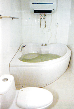 《朝鮮》介紹的萬壽臺街一棟公寓的浴室,內設電熱水器。(韓聯社)