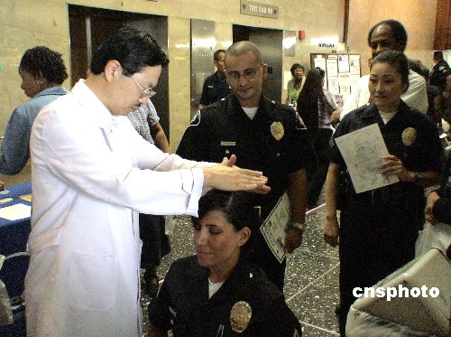 2006年八月三十一日,旅居美國的華人中醫師于士杰先生和他主持的中和漢醫院,應洛杉磯警察局第四次邀請,為一年一度的警察健康展義務示范中醫針灸和中藥治病和養生術。萬名警員和文職人員大排長龍感受療效,直呼神奇。近年來,越來越多的警員到他的中醫診所醫治工傷和職業病。 中新社發 賈國榮 攝